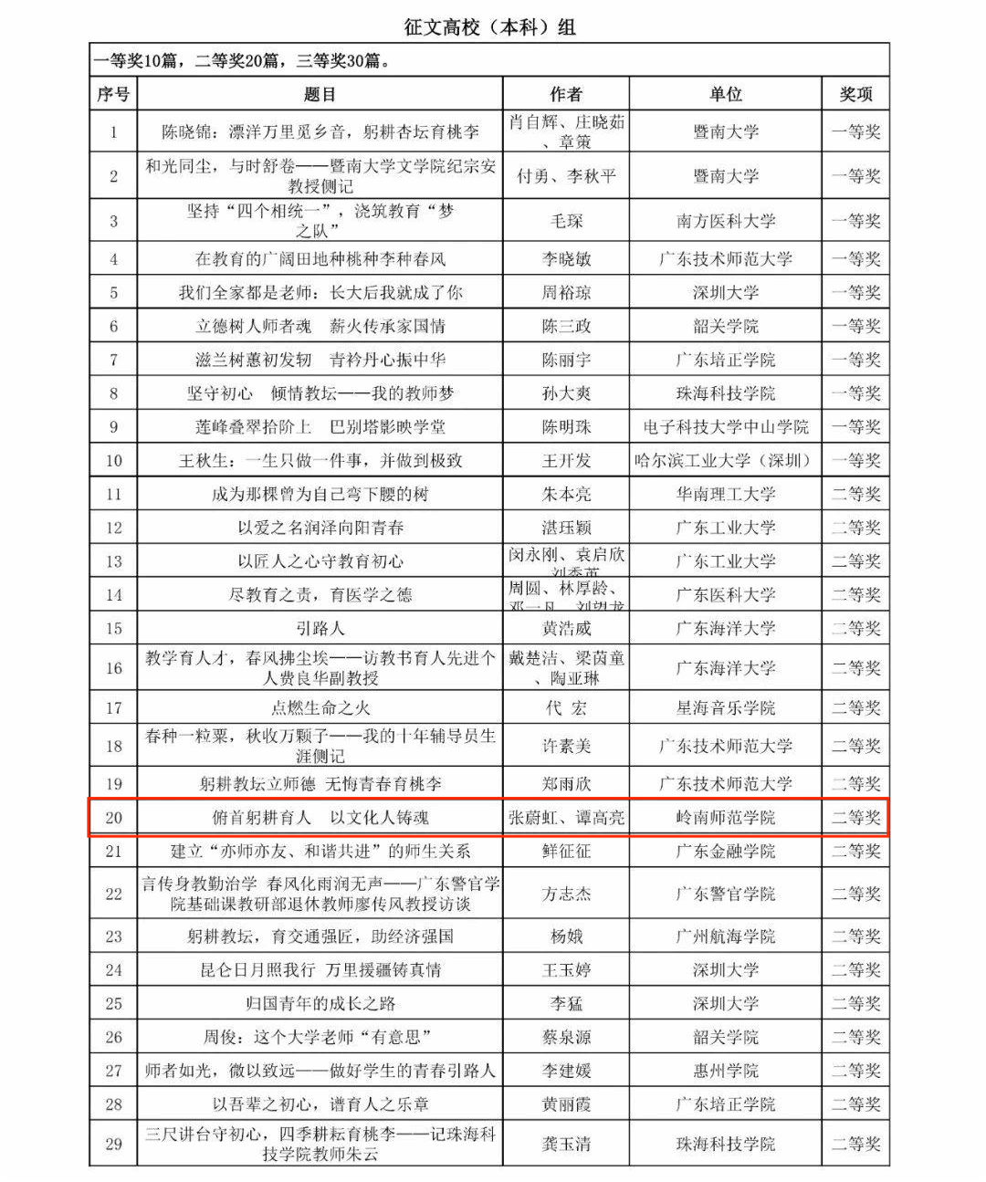 日前,广东省教育厅公布了第十三届师德主题征文及微视频征集活动获奖名单,岭南师范学院在本次活动中获得师德主题微视频一等奖和师德主题征文二等奖。由岭南师范学院离退休人员服务中心党委创作的微视频《我还在奋斗的路上》获师德微视频高校(本科)组一等奖,由文学与传媒学院张蔚虹老师、化学化工学院谭高亮老师共同创作的师德征文《俯首躬耕育人 以文化人铸魂》获师德征文高校(本科)组二等奖。