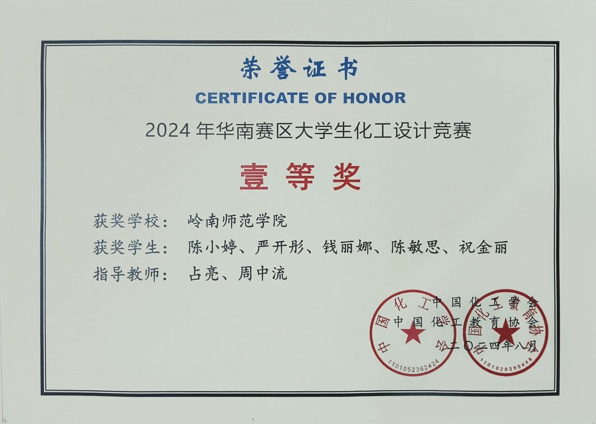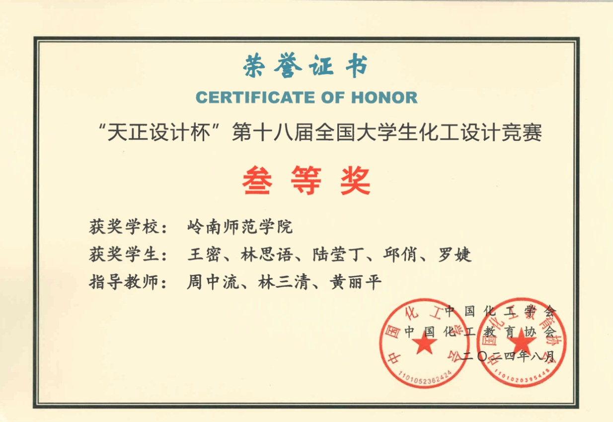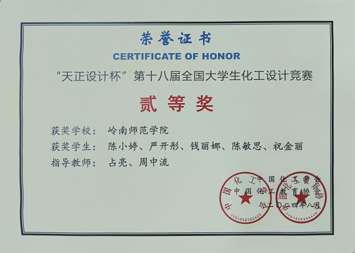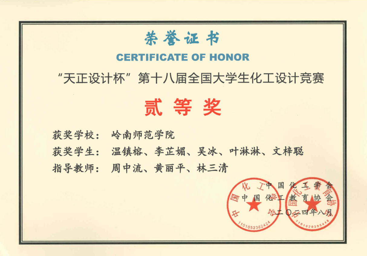 近日,由中国化工学会、中国化工教育协会主办的2024年“天正设计杯”第十八届全国大学生化工设计竞赛在大连理工大学落下帷幕。化学化工学院学子获得全国二等奖2项,全国三等奖1项,华南赛区一等奖1项。