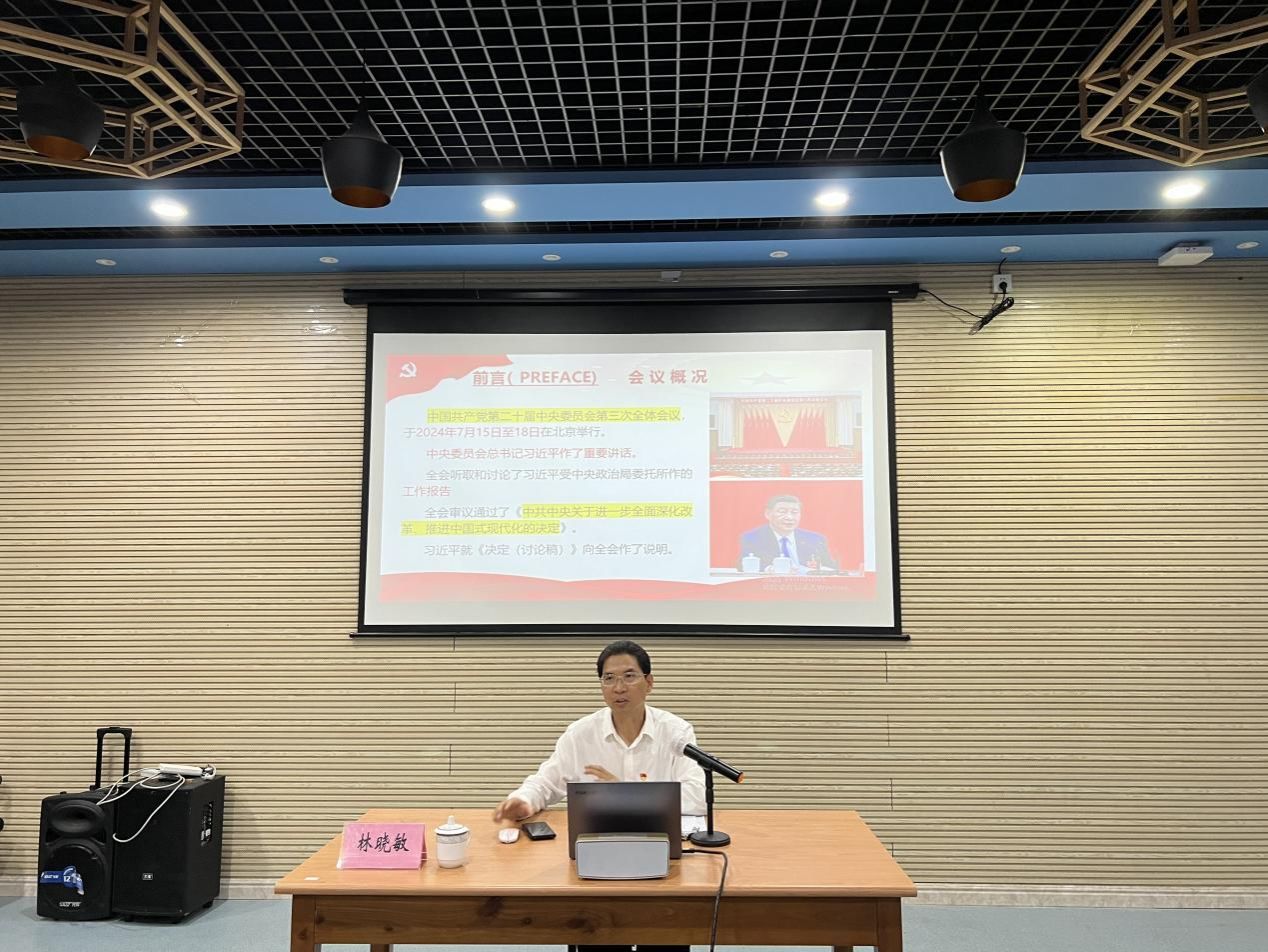 林晓敏指出,党的二十届三中全会是在以中国式现代化全面推进强国建设、民族复兴伟业的关键时期召开的一次十分重要的会议。习近平总书记在全会上的重要讲话,深刻回答了进一步全面深化改革、推进中国式现代化的一系列方向性、根本性重大问题,必须深入学习、深刻领会。林晓敏通过典型案例、详实数据、自身的经历等,从四个方面对党的二十届三中全会精神进行了精准解读与阐释辅导:一是要深刻认识党的二十届三中全会的重大时代意义,二是要深入领会习近平总书记在党的二十届三中全会上的重要讲话精神,三是要准确理解《决定》提出的进一步全面深化改革重大举措,四是要全力抓好党的二十届三中全会精神和改革任务的贯彻落实。林晓敏强调,要深刻认识党的二十届二中全会以来党和国家事业取得的重大成就;深刻认识全会主题,进一步全面深化改革、推进中国式现代化;深刻认识进一步全面深化改革的重要性和必要性;深刻认识进一步全面深化改革的重大原则;深刻认识推进改革中需要把握的一些重大问题;深刻认识党中央对下半年工作的重要部署。学院要深入贯彻落实党的二十届三中全会精神,从思想观念上重视改革发展工作,从顶层设计上谋划改革发展的内容和举措,从实际行动上落实改革实践,规划好硕士点建设,科学配置资源力量,提升两校区办学治理能力,激发教职工活力,以“钉钉子”精神抓好各项改革措施的落地落细,全面落实立德树人根本任务,以高质量党建推动学院高质量发展。