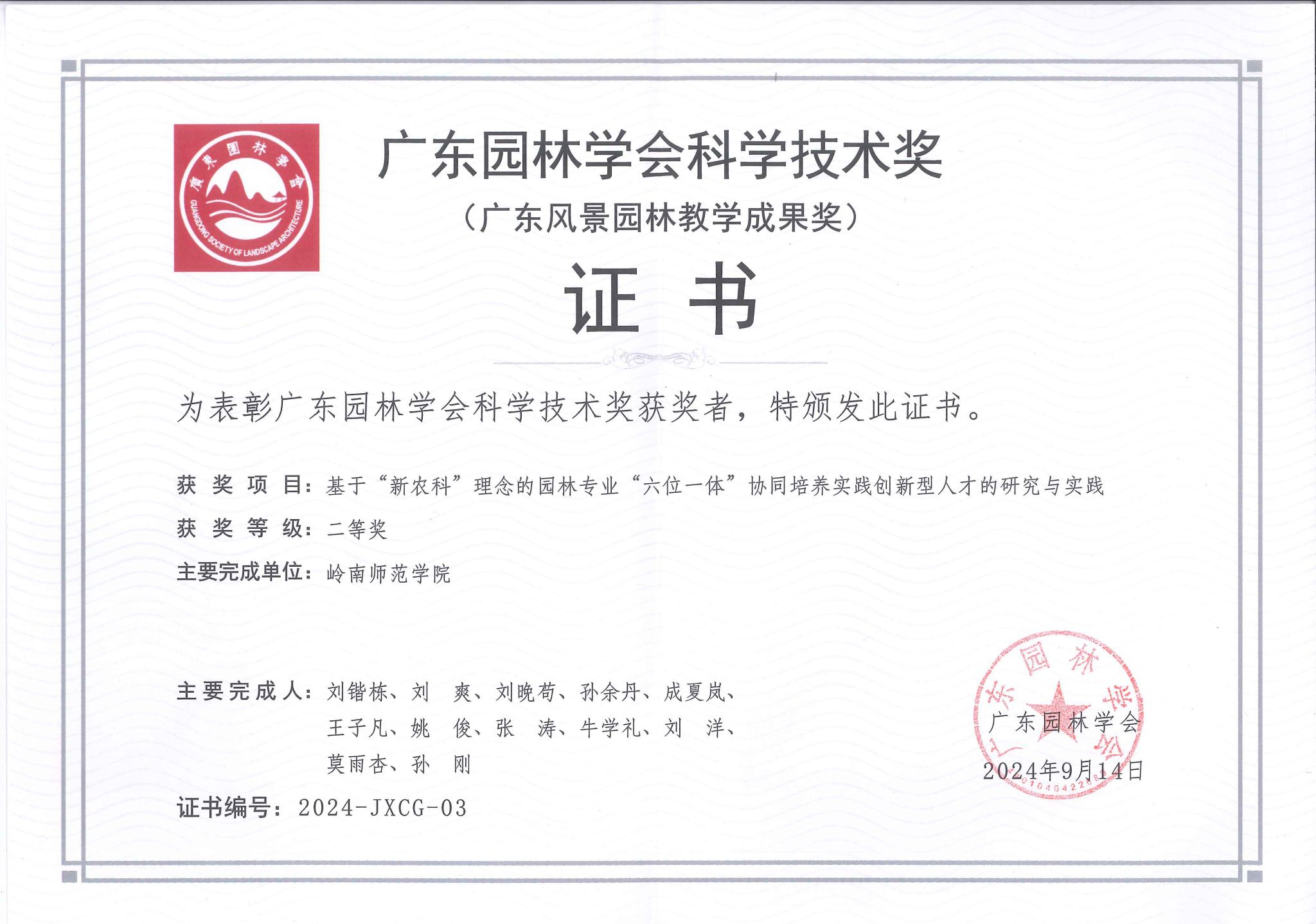 在此次盛会上,进行了广东风景园林教学成果颁奖,生科院园林专业教学成果《基于“新农科”理念的园林专业“六位一体”协同培养实践创新型人才的研究与实践》荣获广东园林学会风景园林教学成果二等奖,展现了学校在园林教育领域的实力,也为学校在园林教育领域树立了良好的品牌形象。