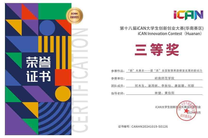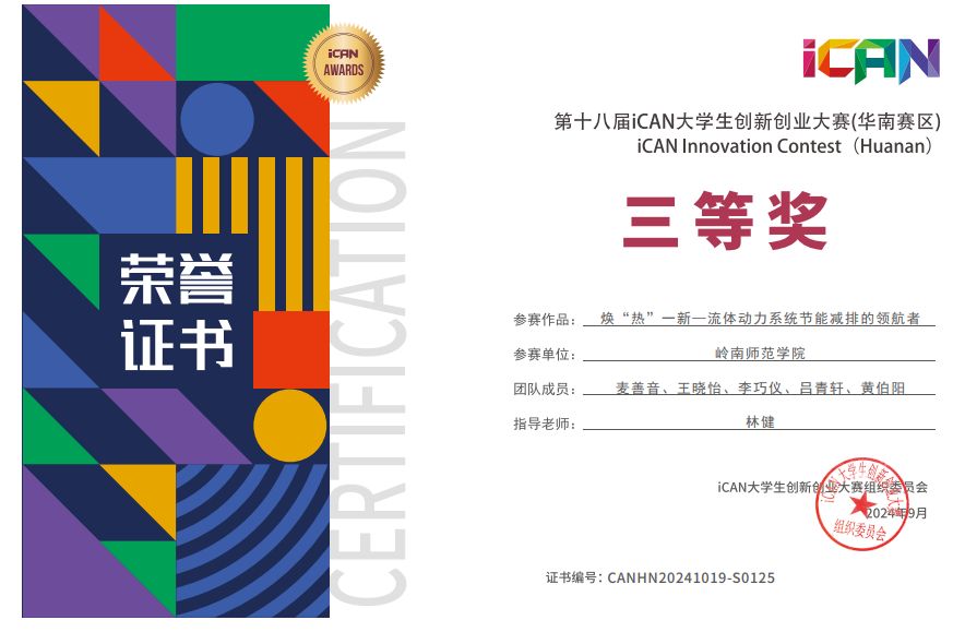 在第十八届iCAN大赛华南赛区分赛中,绿航焕野团队的三份作品均得到了评委的高度认可和赞誉。作品《焕“热”一新-流体动力系统节能减排的领航者》和《“新”光惠农--提“质”全国智慧果蔬棚室发展的新动力》在华南赛区的比赛中斩获三等奖的殊荣。作品《航教智引——国内虚拟航海实训设备领军者》,更是在激烈的竞争中脱颖而出,荣获华南赛区一等奖,并在全国总决赛中斩获三等奖,从省级初赛到全国总决赛,团队成员始终保持着高度的热情和专注,不断完善作品,他们的努力最终换来了丰硕的成果,充分展示了岭南师范学院在创新创业教育方面的实力和水平,进一步激发了学校师生的创新创业热情,推动了学校创新创业教育的深入发展。