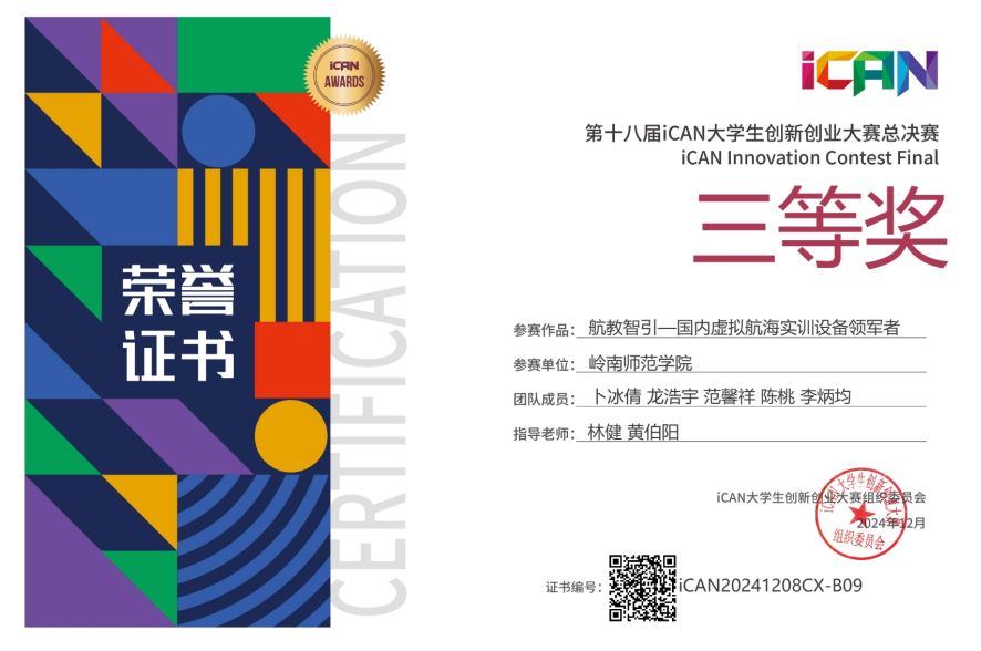 见证中国原创力量。12月6-8日,第十八届iCAN大学生创新创业大赛全国总决赛在山东农业工程学院(淄博校区)成功举办。本届大赛规模空前,吸引了全国1518所高校的32144支团队逐梦,并在创新、创业、挑战三大赛道上展开比拼。经过校赛、分赛区选拔的激烈角逐,最终800支精英团队脱颖而出。在此次大赛中,岭南师范学院计算机与智能教育学院林健博士指导的绿航焕野团队,凭借其作品《航教智引——国内虚拟航海实训设备领军者》表现出色,荣获华南赛区一等奖,并在全国总决赛中赢得三等奖。