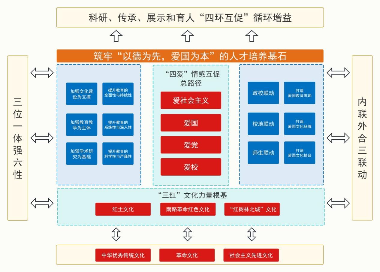 学校获奖教育案例展现学校立足红色文化与爱国主义的价值共通性和情感互融性,用好“三红”文化力量根基,探索爱校、爱党、爱国、爱社会主义“四爱”情感互促总路径,构建爱国主义教育体系,筑牢“以德为先、爱国为本”的人才培养基石,形成科研、传承、展示和育人“四环互促”循环增益的生动实践。