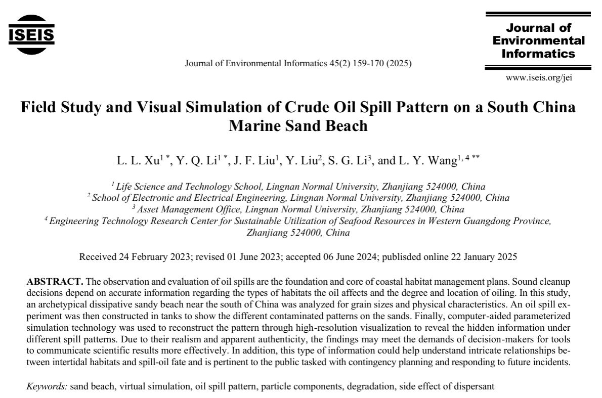近日,生科院海洋环境研究团队王锂韫教授、许乐乐老师指导海洋资源开发技术专业本科生刘嘉峰同学在《Journal of Environmental Informatics》发表了题目为《Field Study and Visual Simulation of Crude Oil Spill Pattern on a South ChinaMarine Sand Beach》的研究论文。