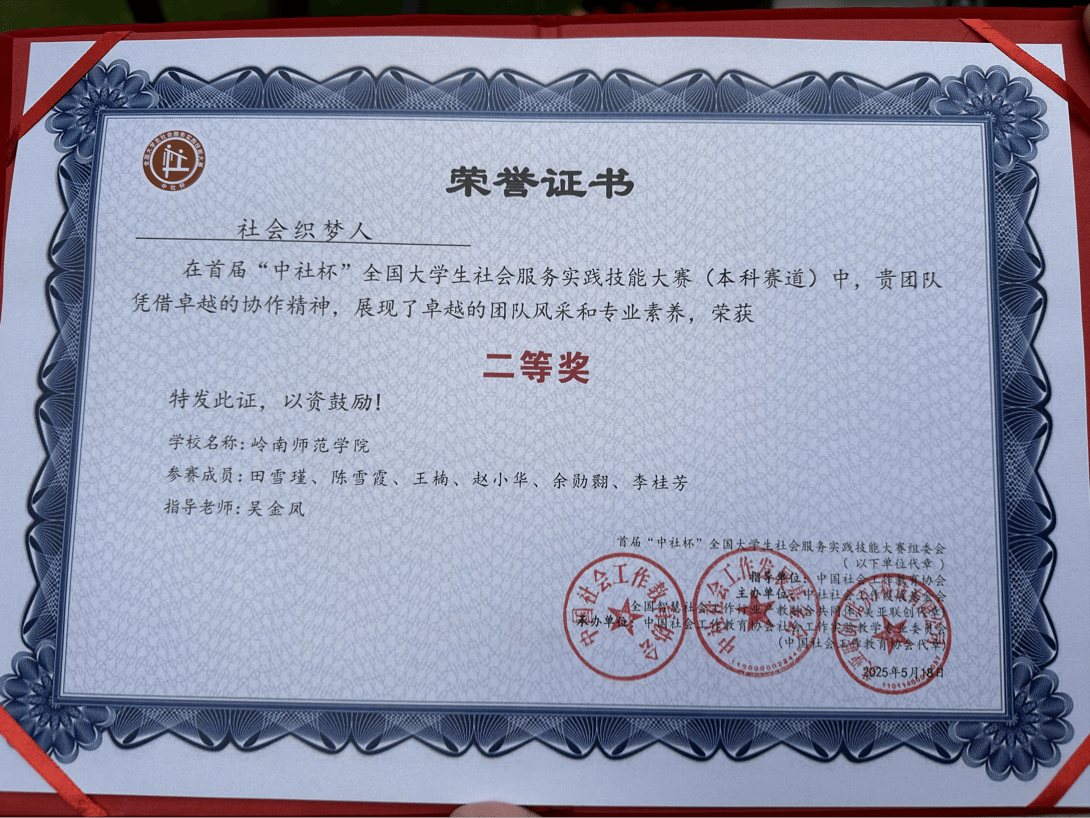 经过近一年的赛程角逐,学校社会与公共管理学院社会织梦队参赛团队凭借扎实的专业素养和出色的实践能力,最终脱颖而出,荣获全国二等奖佳绩,展现了学校社会工作专业学子的风采。