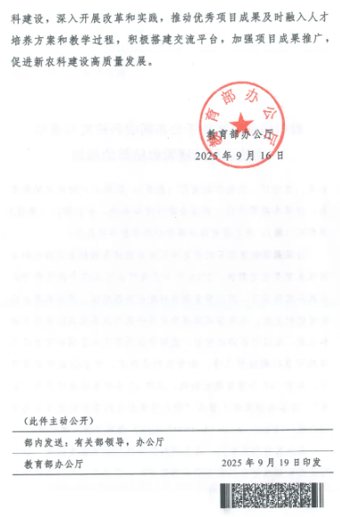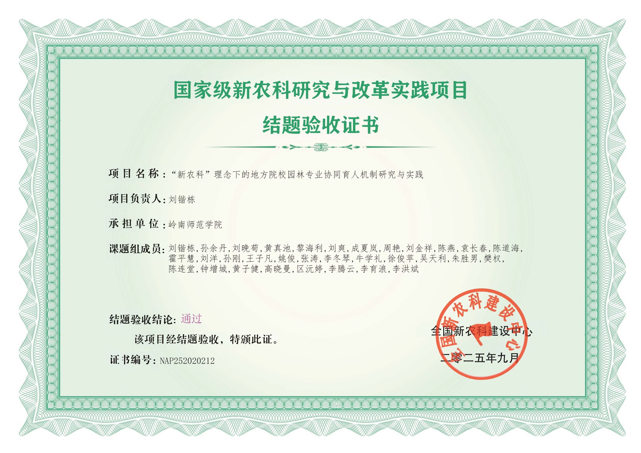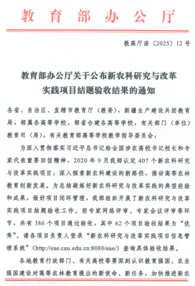 近日,教育部办公厅发布《关于公布新农科研究与改革实践项目结题验收结果的通知》(教高厅函〔2025〕12号),2020年9月教育部认定407个新农科研究与改革实践项目,深入探索新农科建设的新路径,推动高等农林教育创新发展。经专家网络评审、专家会议评审等环节,共有386个项目通过验收。其中生科院刘锴栋教授主持的《“新农科”理念下的地方院校园林专业协同育人机制研究与实践》项目顺利通过结题验收。
