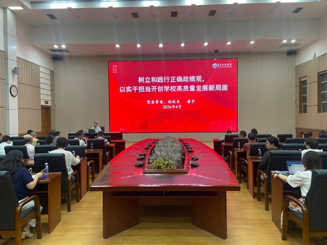 学校在4月2日召开了“以正确政绩观推动高质量发展”理论研讨会,推进政绩观理论研究。阳爱民在会上要求马克思主义学院充分发挥学科优势,深化政绩观相关理论研究,以高质量的理论成果为全校学习教育提供学理支撑,指引学习教育走深走实。学校马克思主义学院迅速落实指示,以“有组织的科研”模式带领教师团队深化政绩观理论研究,聚力以精深研究提升理论水平、认识水平和履职水平,以正确政绩观推动高质量发展。在学院的组织下,蔡卫华开启了关于政绩观的研究思索。在她研究遇到瓶颈的苦闷之时,接到了通知,作为教师代表参加唐宇的专题党课。唐宇的党课以“树立和践行正确政绩观,以实干担当开创学校高质量发展新局面”为主题,围绕“为什么开展学习教育”“什么是正确政绩观”“如何践行正确政绩观”三个核心维度展开,让蔡卫华一下找到了理论的贯通点、联系点与落脚点。