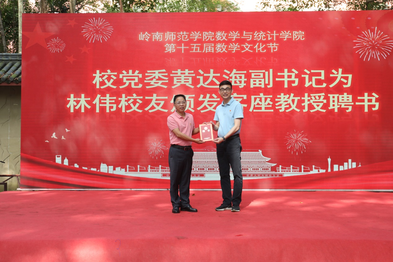 学校党委副书记黄达海寄语并宣布第十五届数学文化节正式开幕,并为第十三届“苏步青数学教育奖”获得者林伟教授颁发客座教授聘书,他表示林伟教授是数计学院的优秀校友,是岭南师范学院的骄傲,希望数计学院紧紧围绕立德树人根本任务,精心经营好数学文化节等育人载体,打造更多更高质量育人平台,培养更多像林伟校友一样的优秀人才。