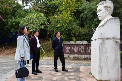 李江凌一行在王胜等陪同下,走访参观了学校的古榕广场、问渠石雕、国学园,谭平山纪念园、百年师范纪念塔、阿勃勒园、慎思园、雷阳广场、问道石雕、第五教学大楼、十三期学生公寓等。