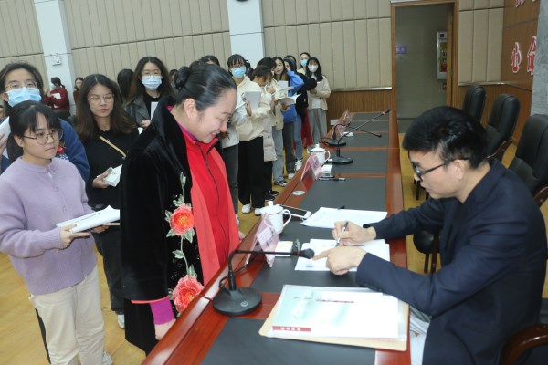 《援藏弦歌》主编、学校党委副书记黄达海为师生签名赠书(赵宇清摄)