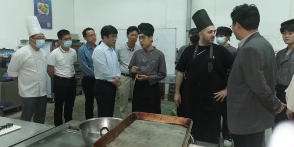 3月25日下午,戴黍副校长一行深入我校鹏园餐厅一楼烹饪与营养教育实训室,考察指导烹饪与营养教育专业中外合作办学项目外教实训课堂,看望上课师生。