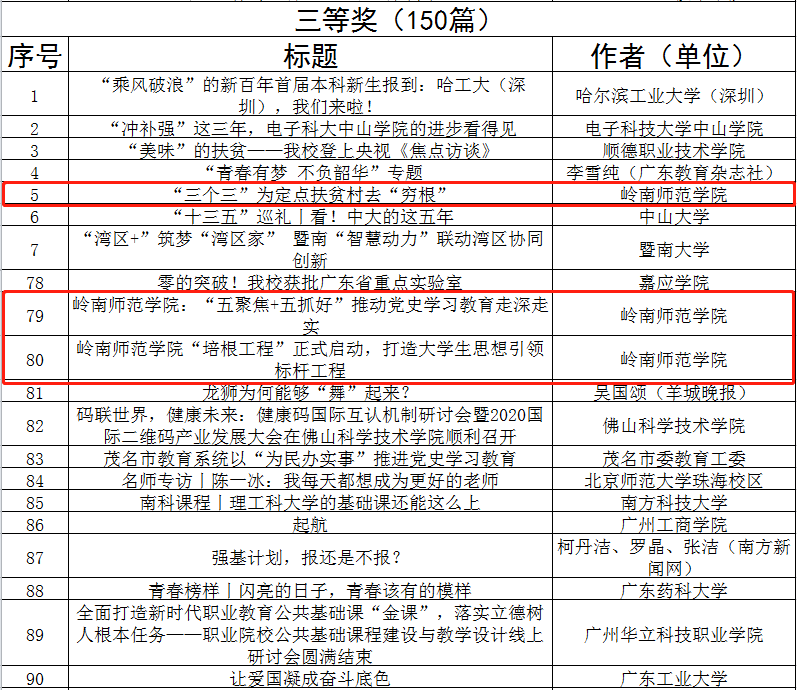 刘坤章、郭莉敏、赵宇清的作品《扎根湛江 厚植立德树人红色基因,党建引领 培育心怀家国优质人才》获一等奖;张少华的作品《发扬“三牛”精神,奋力构建高质量发展新格局》获二等奖;刘坤章、赵宇清的作品《“三个三”为定点扶贫村去“穷根”》,张少华的作品《岭南师范学院:“五聚焦+五抓好”推动党史学习教育走深走实》,郭莉敏、张少华的作品《岭南师范学院“培根工程”正式启动,打造大学生思想引领标杆工程》分别获得三等奖。