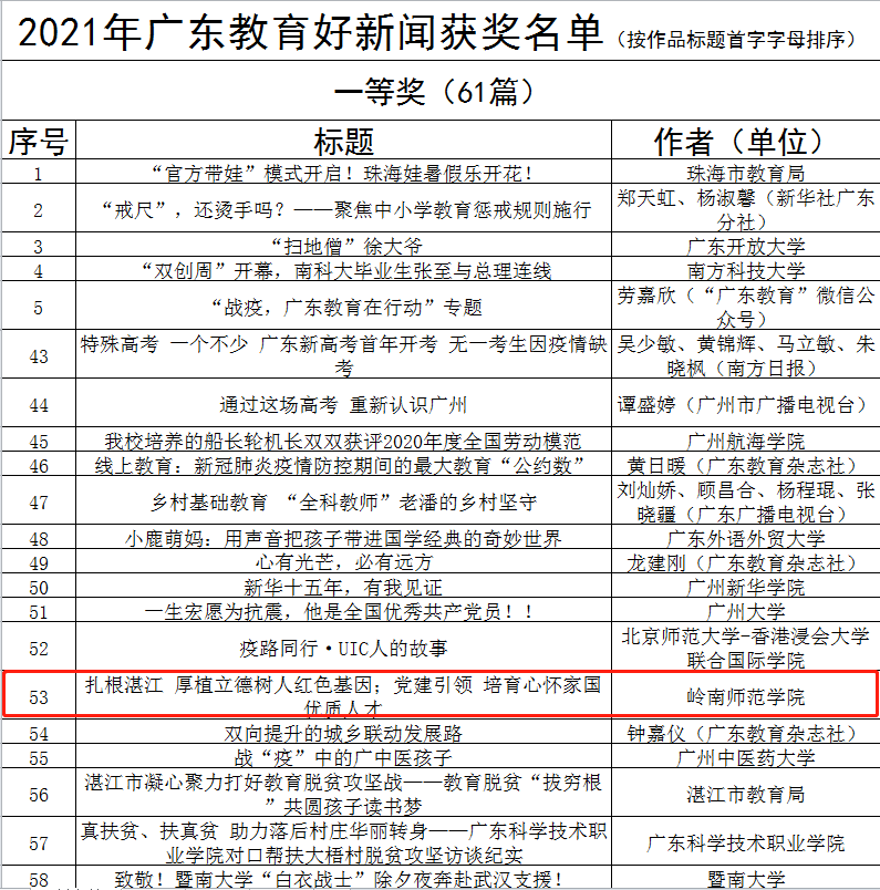 岭师新闻中心讯:2022年3月中旬,广东省教育厅主办的2021年广东教育好新闻评选活动结果揭晓,岭南师范学院共有5件作品获奖,其中一等奖1件,二等奖1件,三等奖3件。