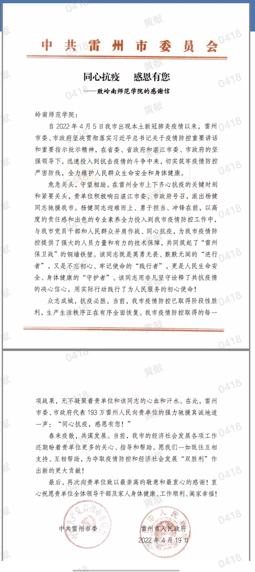 岭师新闻中心讯:“该同志既是英勇无畏、默默无闻的‘逆行者’,又是不忘初心、牢记使命的‘实践者’,更是人民生命安全、身体健康的‘守护者’。”近日,学校收到一份特殊的感谢信,中共雷州市委、雷州市人民政府在感谢信中对我校教师杨健勇于担当、不畏艰辛、逆行“疫”线的奉献精神给予高度肯定。