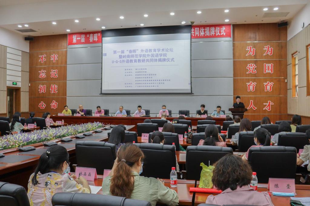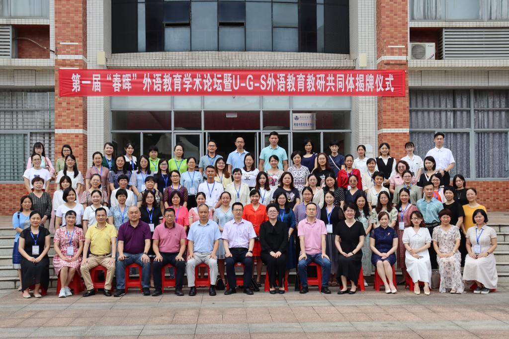 岭师新闻中心讯:6月10日,由岭南师范学院主办的第一届“春晖”外语教育学术论坛在国际会议厅举行。论坛上,岭南师范学院外国语学院U-G-S外语教育教研共同体正式揭牌成立。岭南师范学院副校长金义富,岭南师范学院基础教育高质量发展研究院主任吴涛,湛江市教师发展中心主任王淑丽,湛江第一中学党委书记兼校长郑军,湛江第二中学霞山校区校长陈育新,湛江一中培才学校常务副校长叶译等出席论坛并为共同体揭牌。岭南师范学院外国语学院党委书记陈永国宣读共同体成立和专家顾问聘任通知。论坛由岭南师范学院外国语学院主持行政全面工作的副院长吴晓春主持。