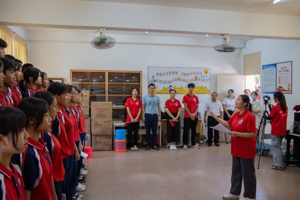 “岭南师范学院的大学生非常认真负责,用心教学,孩子们非常喜欢,学习劲头很足。”湛江市第十九中学校长叶翠玲“点赞”社会实践队,陪同苏古发一行参观了学校的百米校史长廊,从建校82年来的教育变革与成就、劳动教育基地建设、“幸福教育”办学理念等方面介绍了学校基本情况和校园文化建设的亮点,希望未来双方能建立长期、深入、高效的合作关系,共同推进海岛学校基础教育高质量发展。苏古发对市十九中对岭师社会实践工作的大力支持表示感谢,在师生们的共同见证下,将“岭南师范学院大学生社会实践基地”牌匾授予该校,并捐赠一批体育教学用品。