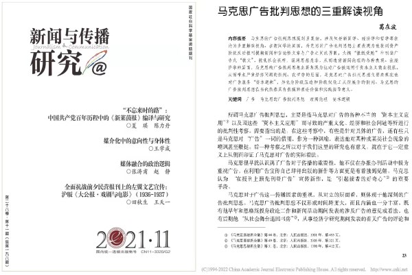 我校文学与传媒学院葛在波博士、副教授独立撰写的论文《马克思广告批判思想的三重解读视角》,在《新闻与传播研究》2021年第11期上发表,全文逾1.2万字。该文是葛在波博士主持的国家社会科学基金项目“唯物史观视域下的广告批判研究”的阶段性研究成果。