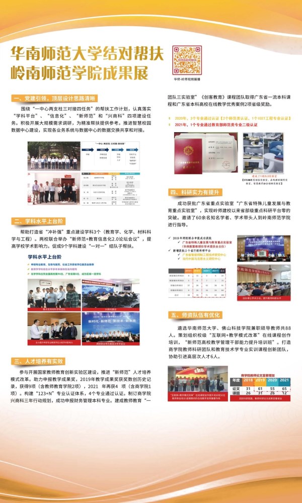 对口帮扶岭南师范学院的华南师范大学获评“优秀帮扶高校”,朱琪教授获评“优秀帮扶队员”。2018-2021年,华南师范大学对口帮扶岭南师范学院工作队积极贯彻落实习近平总书记视察广东重要讲话精神以及省委组织部、省委教育工委关于高校教育人才“组团式”帮扶工作的指示批示,协调资源、积极有为,以党建为引领,围绕申硕核心目标和“一中心两支柱三对接四任务”的帮扶工作计划,在两校党委的高度重视下,在各职能部门和教学单位以及师生的大力支持下开展对口帮扶,助力学校学科实力显著增强、科研成果明显提升、人才培养成效显著、师资队伍能力显著提升。在帮扶后期,帮扶队主动开展调研走访,撰写形成“岭师所需-华师所能”调研报告,为第二轮精准帮扶提供可靠依据和合理建议。