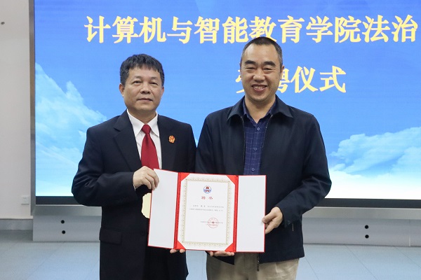 会上,参会领导为校内首个法治宣传教育基地揭牌,张宇院长受聘为计算机与智能教育学院法治副院长。