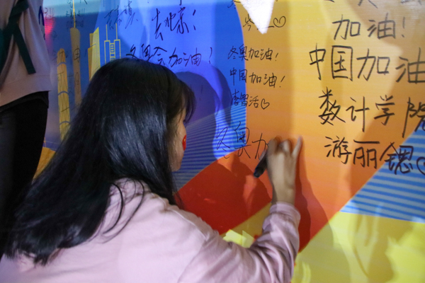 “中国加油,北京加油。”2021级生本1班汤红雅同学开心表示,校园浓厚的运动氛围深深感染了自己,希望这种运动精神能一直延续。“青春爱运动,健康强中国。”2020级地理1班陈文哲同学充分感受到集体运动的激情与快乐。在活动主背景板上,师生们争先写下对冬奥会的祝福和期盼,用实际行动践行体育强国梦。