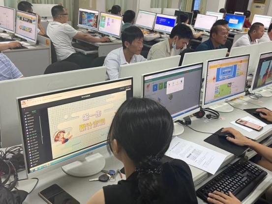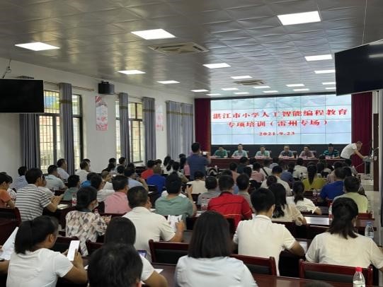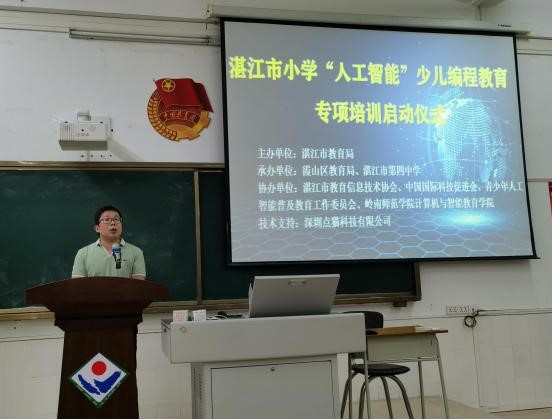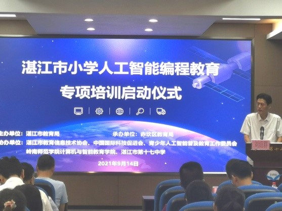 为深入贯彻中央关于建设高质量教育体系的决策部署,全面落实省委、省政府关于推动基础教育深化改革高质量发展的工作要求,加快推进湛江市小学人工智能教育进校园、进课堂,促进湛江市小学人工智能应用和普及水平稳步提升,我校基础教育高质量发展研究院智能教育研究中心团队联合市教育局、市教育信息技术协会、中国国际科技促进会青少年人工智能教育普及工作委员会、深圳点猫科技公司等单位,围绕人工智能教育普及、普适、普惠的目标,探索建立“高校-政府-行业-学校-企业”协作的人工智能教育共同体推进模式,全面启动了湛江市小学人工智能编程教育专项培训活动。
