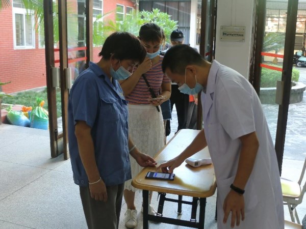 工作人员在入口处核查信息