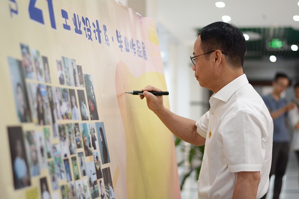 王恒胤对本次作品展给予了高度评价,充分肯定了机电学院专业建设成绩和人才培养质量成效,充分肯定了毕业生创作精神与指导老师的辛勤耕耘,希望机电学院进一步发挥好学科、专业优势,不断丰富党史学习教育的内容与形式,深入贯彻落实学校“1+1+2”工作部署,深化产教融合,促成学生创新理念落地和设计成果转化,推进专业建设水平再上新台阶,为学校高质量发展贡献机电力量。同时,他还与毕业生进行了亲切的交流,表达了对他们的诚挚祝愿,祝福同学们前程似锦,拥有美好的未来,也希望同学们保持务实创新的精神,在新的舞台上充分展示才华,学以致用,未来能设计出更多更好的作品,服务于生活、服务于社会,为实现中华民族伟大复兴的中国梦贡献智慧和力量。