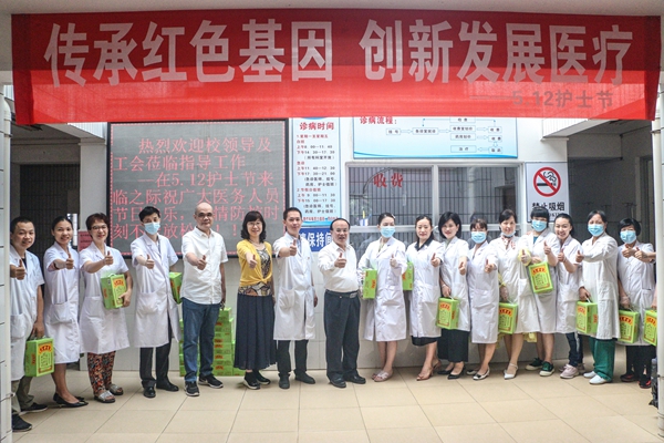 岭师新闻中心讯:今年恰逢是中国共产党成立100周年,为进一步传承红色革命精神,激励广大医务工作者干事创业的激情,5月12日国际护士节,副校长、校工会主席苏古发前往校门诊部亲切看望慰问医务工作者。校工会常务副主席林艳萍及相关负责人一同慰问。