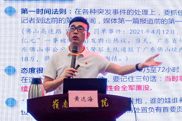 “在新媒体时代,突发事件说来就来,来了以后说发酵就发酵,这也许会成为常态。”黄达海以社会上近期出现的佛山高速路“天量”罚单热点舆情事件为例,旁征博引,指出学校突发事件舆情应对措施的四部曲:精准监测、科学研判、客观处置、评断善后。针对这些应对措施他逐条进行深入浅出的阐释、全面解读,比如在讲到“客观处置”指出“态度很关键:突发事件出现前24、48乃至72小时,全民舆论非理性。在这个阶段处理突发事件,要记住三句话:当时非理性并非长期不理性;先要态度及格,才有后续对话;没有态度及格,理性会全军覆没。”