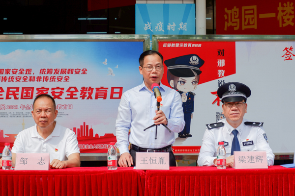 岭师新闻中心讯:4月15日是全民国家安全教育日,学校联合湛江市公安局、中共湛江市委政法委员会、中共赤坎区委政法委员会、赤坎公安分局、寸金街道办事处、共青团赤坎区委在鸿园餐厅东门小广场开展反邪教警示教育进校园活动。学校党委副书记王恒胤宣布反邪教警示教育进校园活动启动仪式开始。