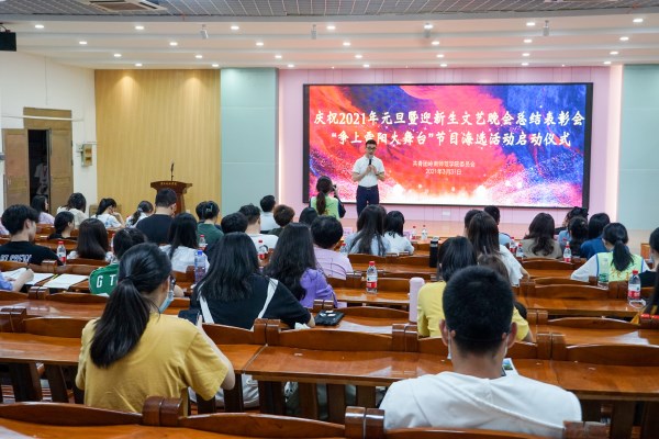 3月31日,在学校庆祝2021年元旦暨迎新生文艺晚会总结会上,全新策划的“争上雷阳大舞台”节目海选活动正式启动。学校党委副书记黄达海出席活动,鼓励师生创作优秀作品“争上雷阳大舞台”,促进学校校园文化建设整体繁荣、提质升级,献礼建党100周年。