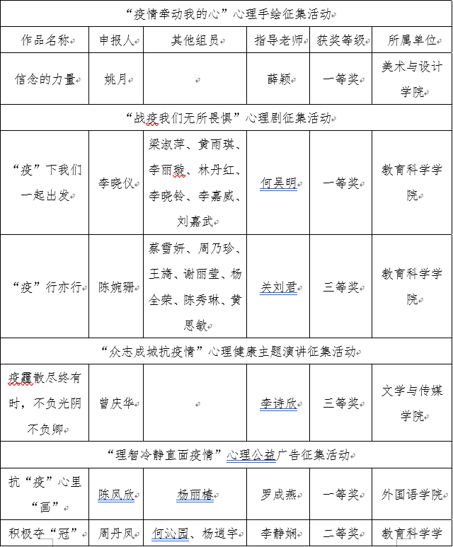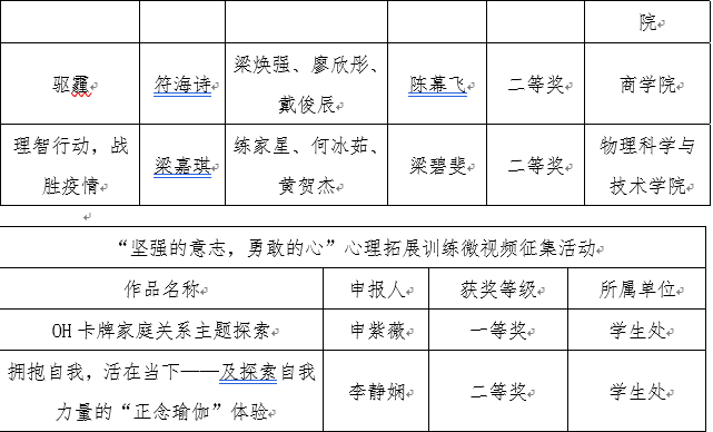 我校心理健康教育与咨询中心将本次活动作为疫情期间普及心理健康教育知识、提升学生积极心理品质的重要契机,通过各二级学院进行了全面发动,鼓励同学们采用多种创新形式进行创作,克服居家隔离期间无法集中录制视频作品的困难。本次五项系列活动的征集取得了良好的效果,经校内评选,我校推选的优秀作品共有20项荣获区域中心的奖项,最终于广东省的决赛中取得10项奖项的好成绩,其中我校心理剧《“疫”下我们一起出发》更是以全省第一名获得一等奖!