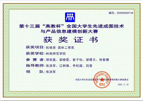 2020年11月13日-16日,第十三届“高教杯”全国大学生先进成图技术与产品信息建模创新大赛成功举办。岭南师范学院机电工程学院郑剑鑫、梁晓雯、崔子怡、邹樱兰、钟紫珊、胡翠雯6名同学,在指导老师张洪军、江树镇、李杞超、吕莹的带领下,经过激烈角逐,获得机械类团体二等奖1项(全国排名第69)、个人一等奖2项、个人二等奖4项、机械类优秀指导老师二等奖4项,刷新机电院历史成绩。