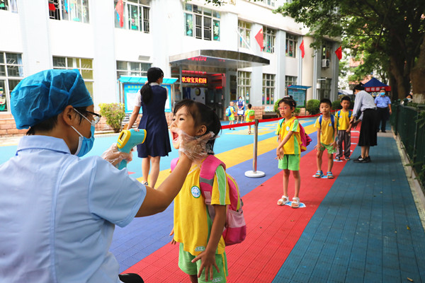 岭师新闻中心讯:解下口罩、清洁鞋子、消毒双手、排队晨检、体温检测……6月8日上午,岭南师范学院幼儿园迎来了第一批返园儿童。身穿园服的小朋友在老师们的指引下,认真完成每一个防控步骤,开心入园。学校根据湛江市教育局关于做好防疫复学的相关要求,认真做好幼儿园返校复学验收工作,确保顺利开园。