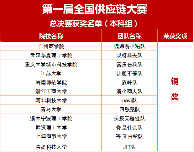 近日,由中国物流与采购联合会主办,厦门易木科技提供技术支持的“第一届全国供应链大赛”总决赛圆满落下帷幕。经过激烈的角逐,由商学院物流专业学生巫妙球、周李华、洪秋燕、李彩霞组成的“逐峰队”继获得全国复赛一等奖后,再获供应链大赛总决赛全国铜奖。此外,我校刘长军、李鸿媛老师被授予全国供应链“优秀指导老师”称号,学生们通过考核认证,获得了物流从业人员职业能力中级资格证书。