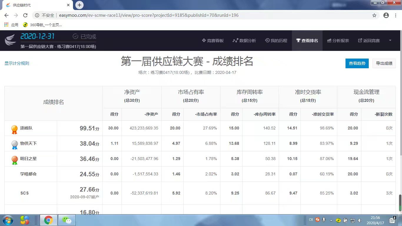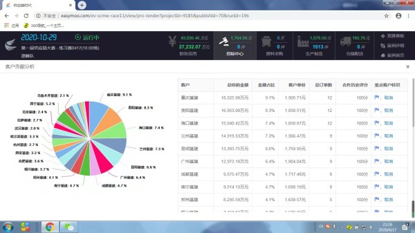 在刘长军、李鸿媛老师的带领下,我校参赛选手积极备赛,于2月初开始展开每天超过4小时的供应链练习赛。在队长的组织下,大家刻苦训练,并通过小组讨论不断去摸索和研究,探讨不同的比赛策略,不断提高竞技水平和竞赛能力。运用自己的专业知识进行市场分析、客户分析、供应商分析、区域配套分析等,确定供应链运营整体思路。在连续几个月的供应链练习中,每个团队成员都认真对待,努力学习,积极参与交流讨论,共同进步,不断提高团队合作意识和团队协作能力,同时也积极跟其他高校的参赛队伍交流沟通,共同学习新技能。正是凭着刻苦训练,顽强拼搏的精神,队员们一路过关斩将,顺利通过积分赛、复赛、决赛,最终取得可喜的成绩。