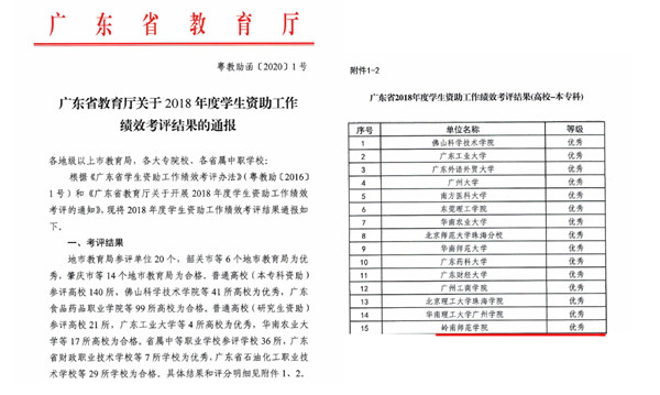 近日,广东省教育厅公布了2018年度全省学生资助工作绩效考评结果(粤教助函[2020]1号),岭南师范学院学生资助工作绩效考核获评“优秀”。