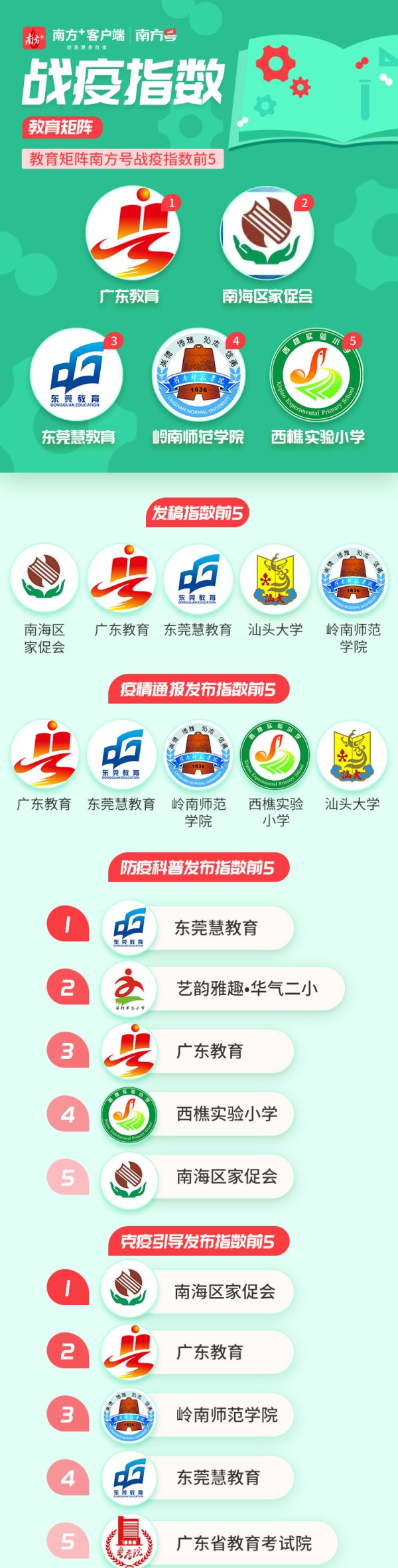 这次“南方+”教育矩阵战“疫”指数排名数据统计时间从1月23日至2月12日,分别从战疫稿件发布、疫情通报数据、防疫科普宣传、共克时疫引导四个维度综合考量各南方号战疫表现,根据加权计算得出南方号战疫指数。