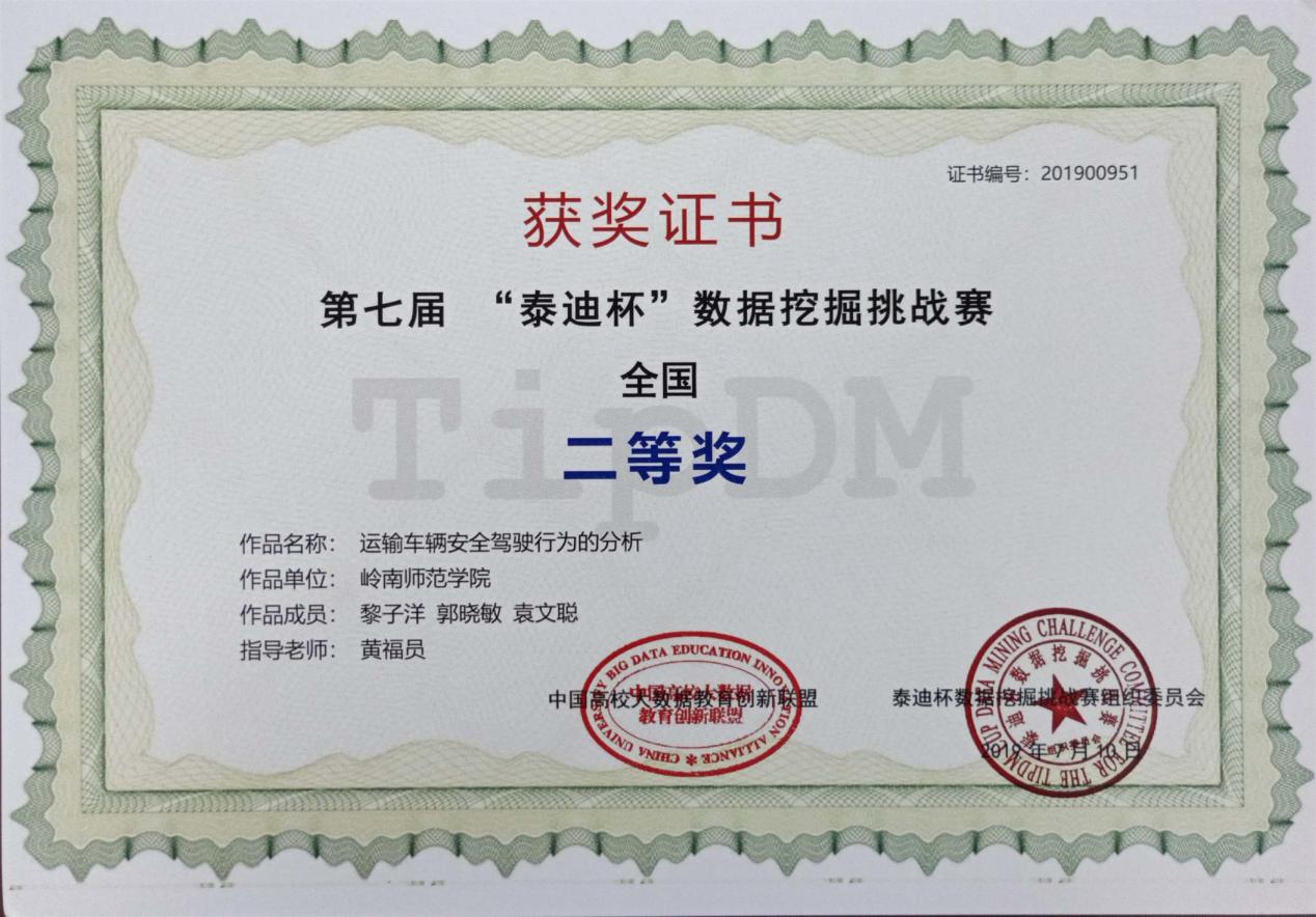 近日,第七届“泰迪杯”全国大学生数据挖掘挑战赛颁奖会落下帷幕。数计学院2016级学生黎子洋、郭晓敏和袁文聪组成的参赛队荣获全国二等奖,另有3支参赛队伍获得全国三等奖。