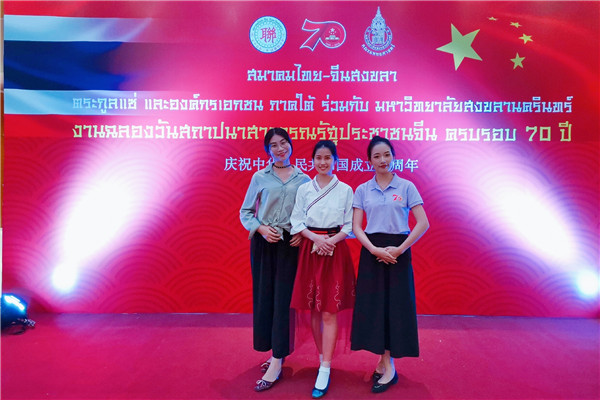 9月21日,中央电视台《朝闻天下》报道了由泰国宋卡王子大学、宋卡泰中侨团总会,宋卡五属会馆等联合举办的庆祝中华人民共和国成立70周年的活动。这次活动以“携手‘一带一路’ 共创中泰未来”为主题。活动当天,泰国政府政要、中国驻泰国大使、驻宋卡总领事等与当地华人、华侨2000多人欢聚一堂,载歌载舞共庆新中国70华诞。岭南师院目前正在泰国开展汉语教育志愿活动的2015级校友伍惠琳、黄丹丹、马冰参与其中,参演了《我和我的祖国》合唱、《共圆中国梦》现代舞、《粉墨》古典舞、《伟大的中国梦》歌伴舞、《追寻》歌伴舞和《云裳谣》舞蹈等6个节目。