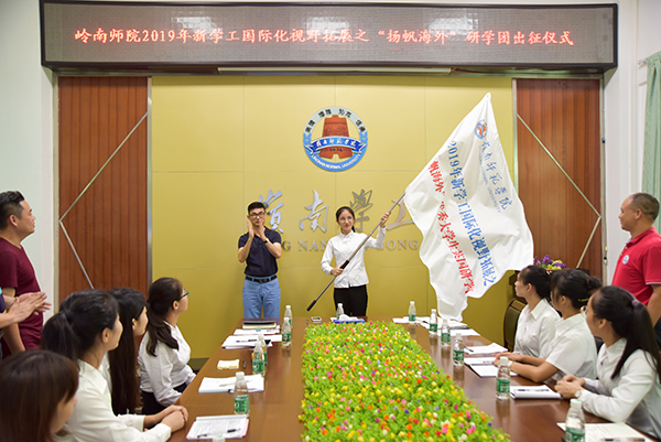 岭师新闻中心讯: 7月19日下午,我校2019年“新学工”国际化视野拓展之“扬帆海外”研学团出征仪式在紫荆楼301举行。党委副书记黄达海为研学团授旗,寄语学子们在海外研学期间,要展现出自信、从容、大度的中国青年形象,完成考察英国学生事务管理以及研习专业知识的任务。