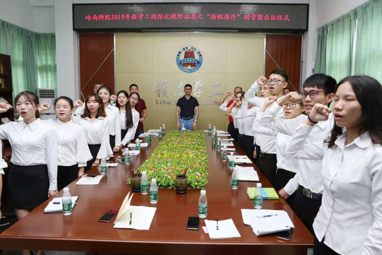 学生处处长李粤指出,每一次出国就是一次爱国主义教育。他希望队员们走出国门后要扬起自信,展现大国的青年学子风采。学生处副处长陈永国主持出征仪式。研学团全体成员庄重宣读了2019“扬帆海外”出征宣誓词,互相分享了研学计划和目标。