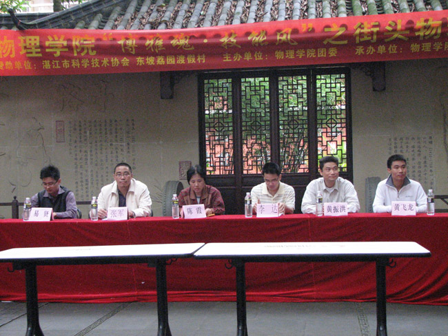湛师新闻网4月26日讯 昨天上午,物理学院在古榕广场举行“博雅魂·技能风”系列活动之街头物理大赛。湛江市科学技术协会科普部部长兼副秘书长黄振洪,物理学院陈霞教授、张军博士、李达老师及辅导员易贤老师出席了大赛。
