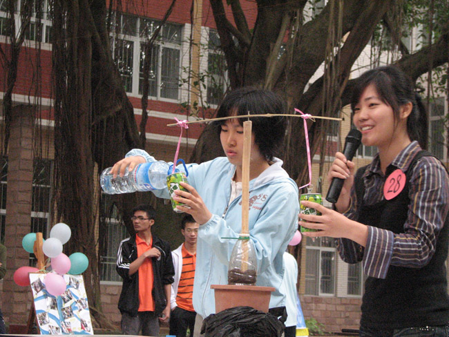 比赛分现场解说和演示两部分。其中,由07科学教育班张沛、莫少文与罗锐锋制作的“光雷达”具有一定的科技性和实用性。通过他们精彩的解说和演示,观众对此作品的材料、制作原理、产生的现象、创新点等都有了整体的了解。此外,还有不少优秀的参赛作品,如 “中式型泰坦尼克号“、“太阳能环保节能灯”、“检磁灯” 等,不仅具有可观性、趣味性、实用性,还很好地紧扣了大赛“博雅魂·技能风”的主题,体现了参赛者融理论知识于实践中的能力。