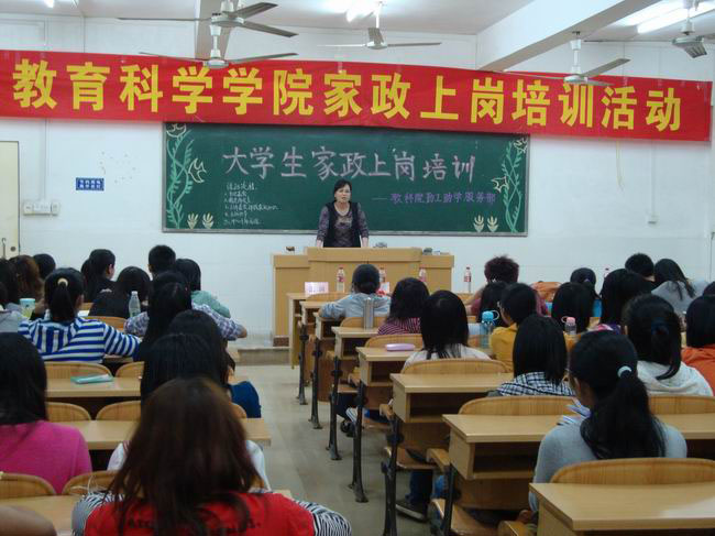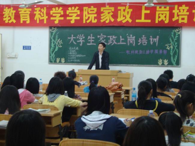 湛师新闻网4月26日讯 昨晚,教科院勤工助学服务部在燕雷楼402室举行大学生家政上岗培训活动。教科院辅导员魏珂老师、“一步通”家政公司主管莫小姐出席了活动。