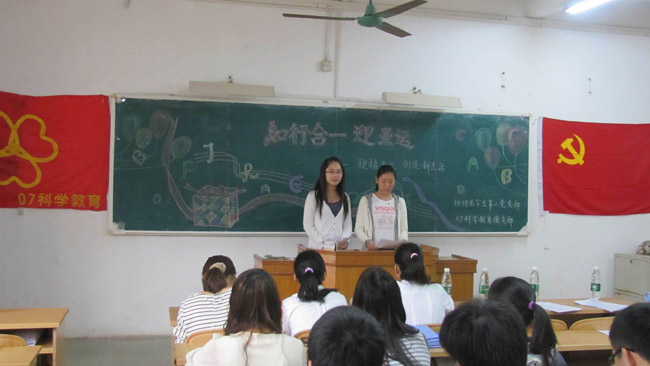 湛师新闻网4月25日讯 昨天上午,物理学院物理系第二学生党支部和07科学教育团支部在榕燕楼103教室,开展了主题为“知行合一迎亚运”的党团活动。