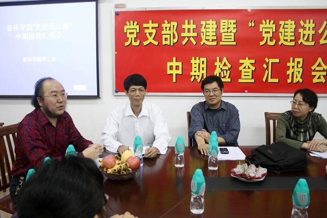 湛师新闻网4月21日讯 昨晚,音乐学院在该院会议室召开党支部共建暨“党建进公寓”中期检查汇报会。校党委胡克伟副书记、校组织部邓妍妍部长等出席了汇报会,与会人员还有音乐学院党委书记刘福瑞,辅导员李纳、谢锦江老师以及党建示范宿舍学生代表。会议由该院党委黄增副书记主持。