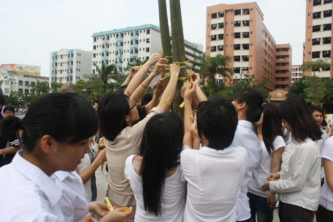 默哀活动结束后,同学们纷纷解下手中的黄丝带,系在旁边的树枝上,以表达自己对玉树遇难同胞的深切哀悼和对玉树未来的美好祝福。