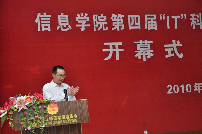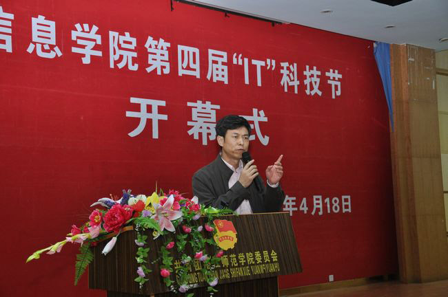 最后,校领导邵乐喜副院长为开幕式致辞。他表示,非常感谢组委会连续举办四届IT科技节,这对推动学校整体创新意识氛围的建设是一个很好的范例。邵副院长还指出,举办IT科技节是信息学院办学理念的具体体现,希望信息学院通过IT科技节强化创新意识,选拔更多在创新意识上有潜力的人才,让同学们能在这个舞台上展示创新理念。