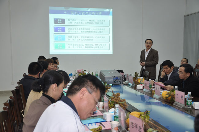 陈宜局长在总结讲话中表示,湛江市科技局到信息学院调研,主要目的是加强校地合作,充分依托信息学院的研发能力,整合人才与师资力量,为地方与学院在人才培养、实训基地建设、提高企业产品的科技含量等方面牵线搭桥,并希望在今后的工作中,双方加强信息沟通,湛江市科技局将邀请学院有关专家、教师到企业调研,同时,以此次调研会为契机,启动湛江市中小企业信息科技应用水平调研,建立湛师信息学院与廉江市信息中心、遂溪县信息中心等部门资源共享与全面合作的大平台。